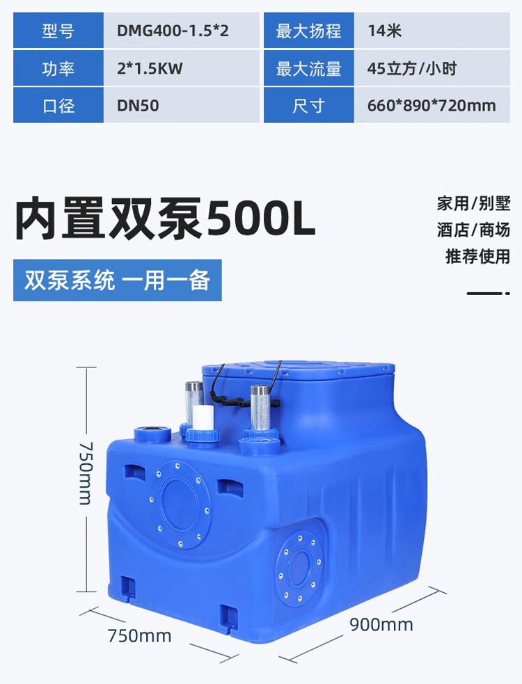 米诺内置泵HDPE别墅/商场用地下室污水提升器